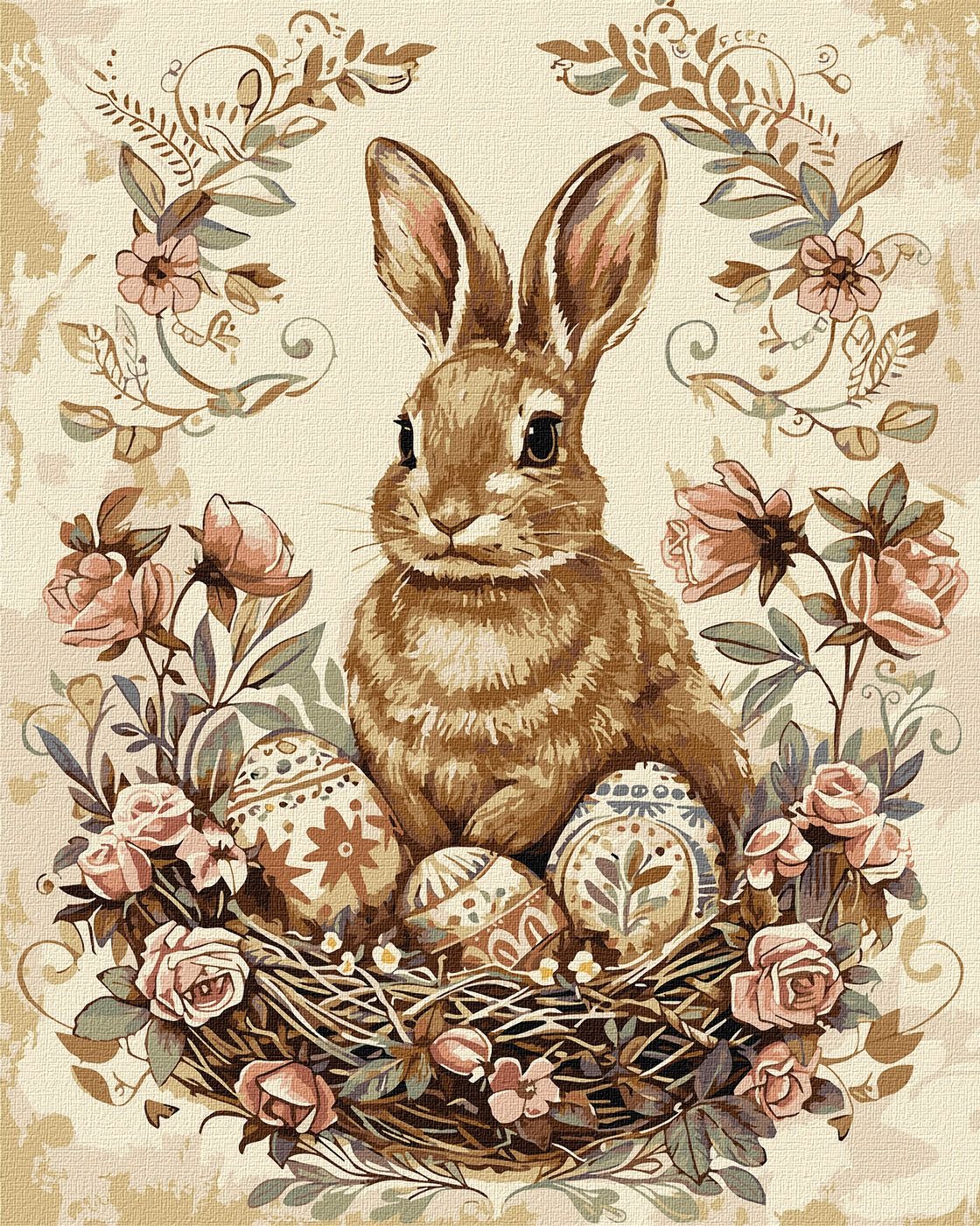 Сюжет із милим великоднім кроликом передає тепло, радість і святковий настрій. Така картина стане чудовим елементом декору до Великодня.